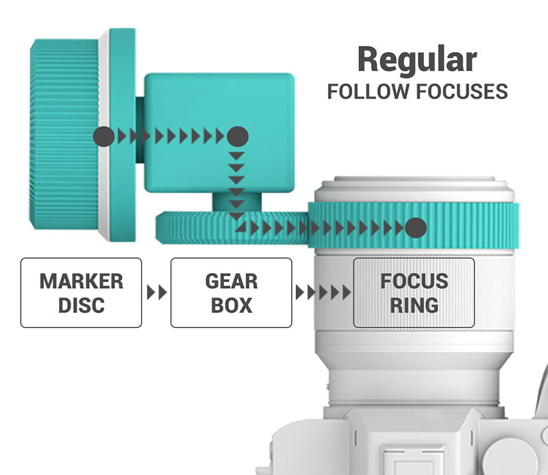 Gearboxes on regular follow focuses are between the marker disc and the focus ring, resulting in a loss of precision because of gear play in the gearbox.